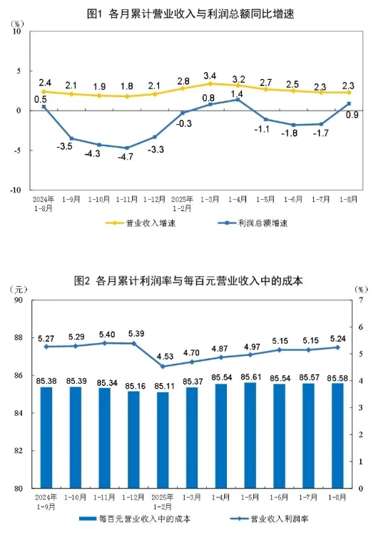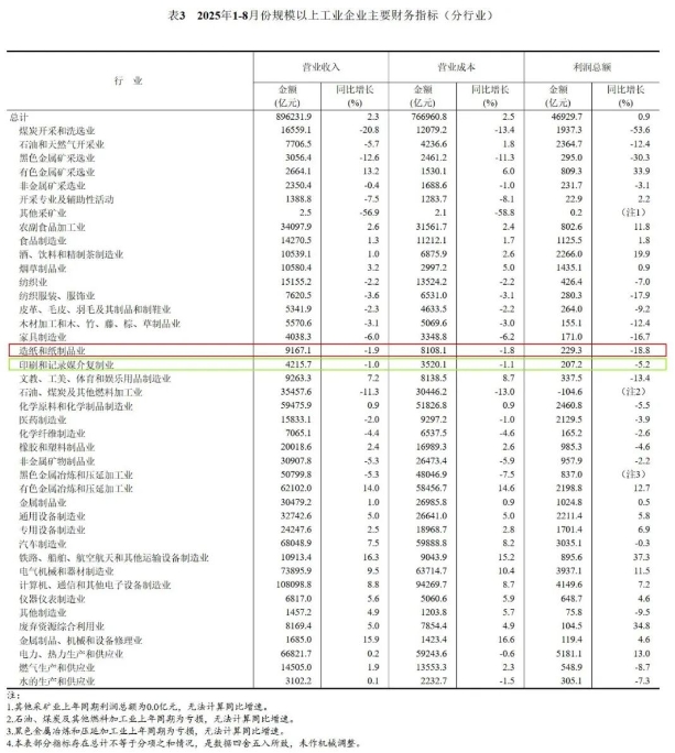 1—8月份,規(guī)模以上工業(yè)企業(yè)實現(xiàn)營業(yè)收入89.62萬億元,同比增長2.3%;發(fā)生營業(yè)成本76.70萬億元,增長2.5%;營業(yè)收入利潤率為5.24%,同比下降0.06個百分點。其中,造紙和紙制品業(yè)實現(xiàn)營業(yè)收入9167.1億元,同比下降1.9%;印刷和記錄媒介復制業(yè)實現(xiàn)營業(yè)收入4215.7億元,同比下降1.0%。 8月末,規(guī)模以上工業(yè)企業(yè)資產(chǎn)總計185.08萬億元,同比增長5.0%;負債合計107.34萬億元,增長5.4%;所有者權益合計77.73萬億元,增長4.4%;資產(chǎn)負債率為58.0%,同比上升0.2個百分點。 8月末,規(guī)模以上工業(yè)企業(yè)應收賬款27.24萬億元,同比增長6.6%;產(chǎn)成品存貨6.73萬億元,增長2.3%。 1—8月份,規(guī)模以上工業(yè)企業(yè)每百元營業(yè)收入中的成本為85.58元,同比增加0.19元;每百元營業(yè)收入中的費用為8.37元,同比減少0.08元。 8月末,規(guī)模以上工業(yè)企業(yè)每百元資產(chǎn)實現(xiàn)的營業(yè)收入為74.0元,同比減少2.0元;人均營業(yè)收入為183.5萬元,同比增加5.7萬元;產(chǎn)成品存貨周轉(zhuǎn)天數(shù)為20.5天,同比增加0.1天;應收賬款平均回收期為70.1天,同比增加3.7天。 8月份,規(guī)模以上工業(yè)企業(yè)利潤同比由上月下降1.5%轉(zhuǎn)為增長20.4%。 國家統(tǒng)計局工業(yè)司首席統(tǒng)計師于衛(wèi)寧解讀2025年1—8月份工業(yè)企業(yè)利潤數(shù)據(jù)表示,1—8月份,在宏觀政策發(fā)力顯效、全國統(tǒng)一大市場縱深推進,疊加去年同期低基數(shù)等多重因素作用下,規(guī)模以上工業(yè)企業(yè)利潤同比增長0.9%,裝備制造業(yè)支撐有力,不同規(guī)模企業(yè)利潤均有所改善。工業(yè)企業(yè)利潤明顯改善;工業(yè)企業(yè)營收保持穩(wěn)定增長;裝備制造業(yè)“壓艙石”作用明顯;原材料制造業(yè)利潤增長較快,消費品制造業(yè)利潤由降轉(zhuǎn)增;不同規(guī)模企業(yè)利潤均有改善,私營企業(yè)利潤明顯加快;8月企業(yè)單位成本下降,營收利潤率回升。